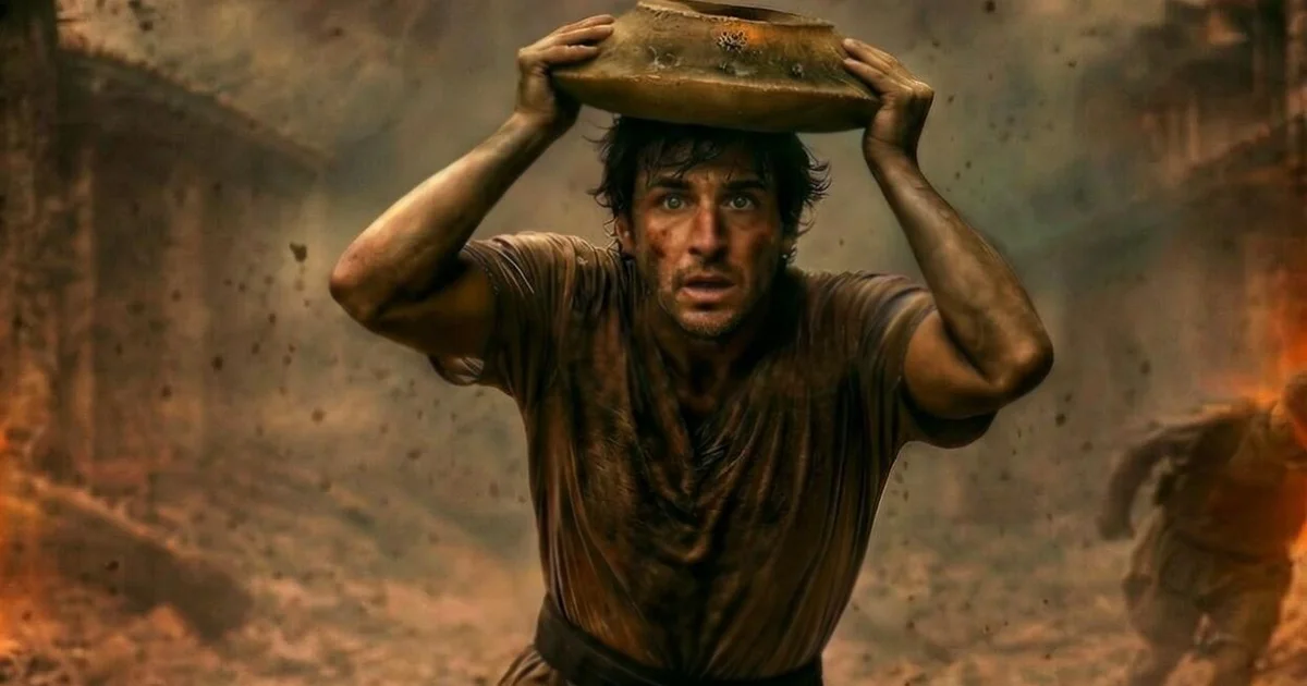 Archaeologists found the victim holding a terracotta mortar, which they interpret as an improvised attempt to shield his head from falling lapilli, the small volcanic stones that rained down during the eruption.