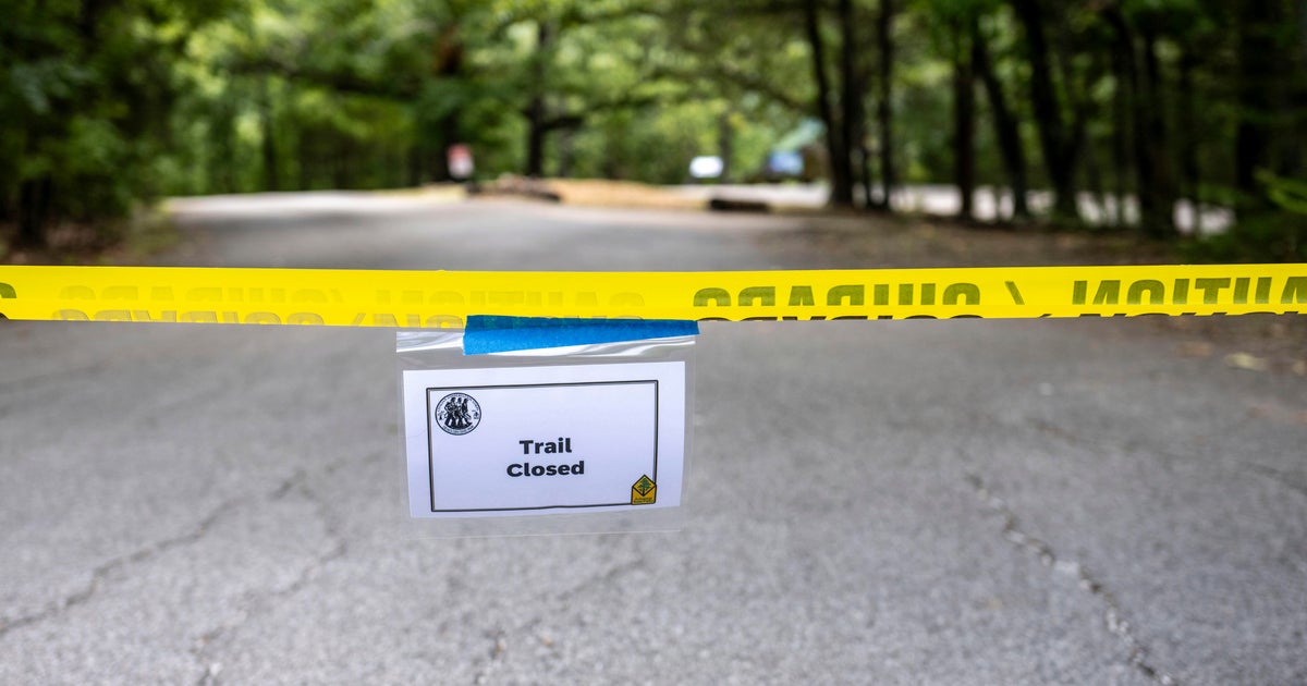 The trail head to the Yellow Rock Trail at Devil’s Den State Park is closed off as officials keep all trails closed Monday, July 28, 2025, in West Fork, Ark.