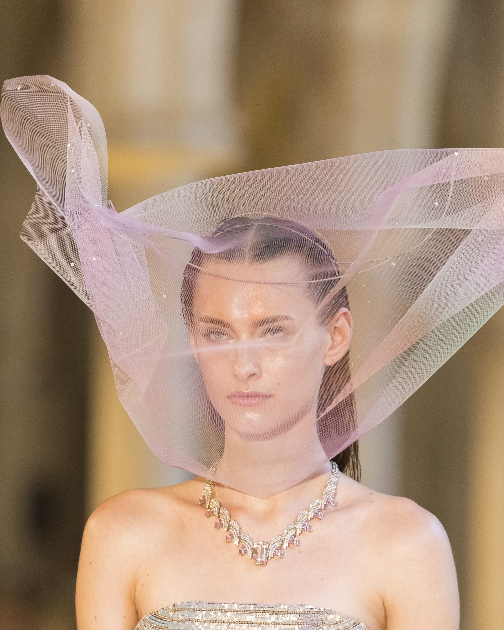 Lisa Haydon dazzled in a sculpted diamond necklace featuring kunzite and tourmaline at Paris Couture Week.