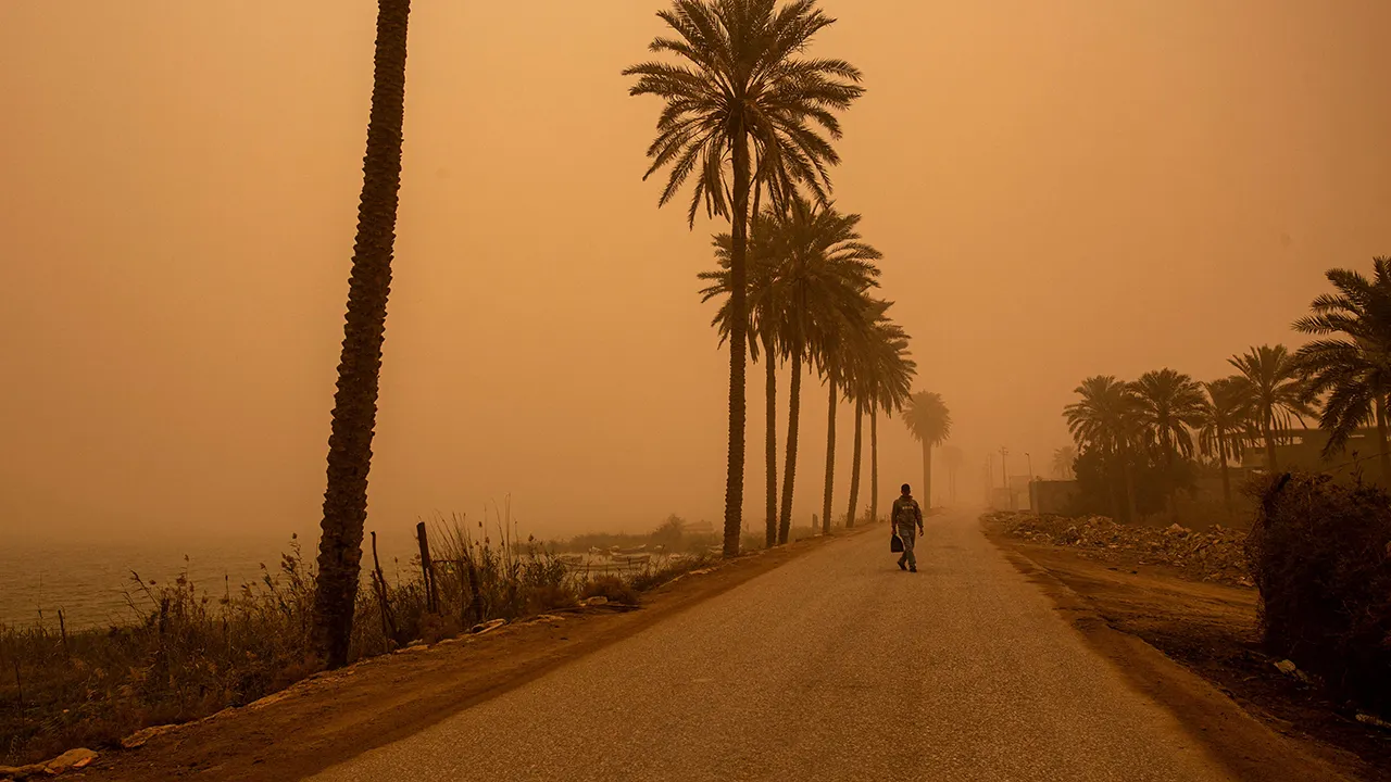 A man walks along a road during a sand storm in Basra, Iraq, on March 4, 2022. (Hussein Faleh/AFP)