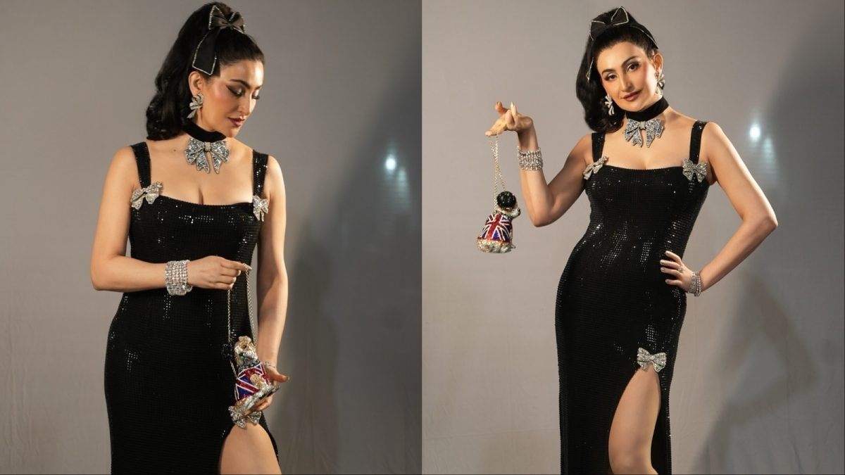 Balancing the quirky handbag was a sleek, black sequin gown that glistened under the lights. Featuring a daring thigh-high slit, the dress exuded drama while maintaining sophistication. What truly elevated the look were the crystal butterfly embellishments perched delicately on the straps and waistline. These playful details tied back to the quirky energy of the clutch, proving Passi’s ability to merge contrasting elements into a cohesive, high-fashion moment.