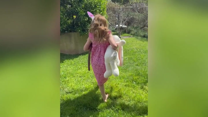 Lilibet walks through a garden wearing bunny ears and carrying a plush rabbit, while Archie decorates Easter eggs.