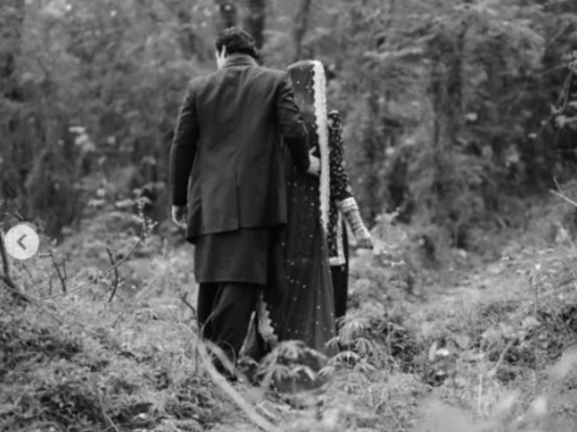 The couple shared photos from their bridal shoot, with Ramsha wearing an exquisite red outfit paired with green jewelry, while Khushhal opted for a classic black kurta suit.