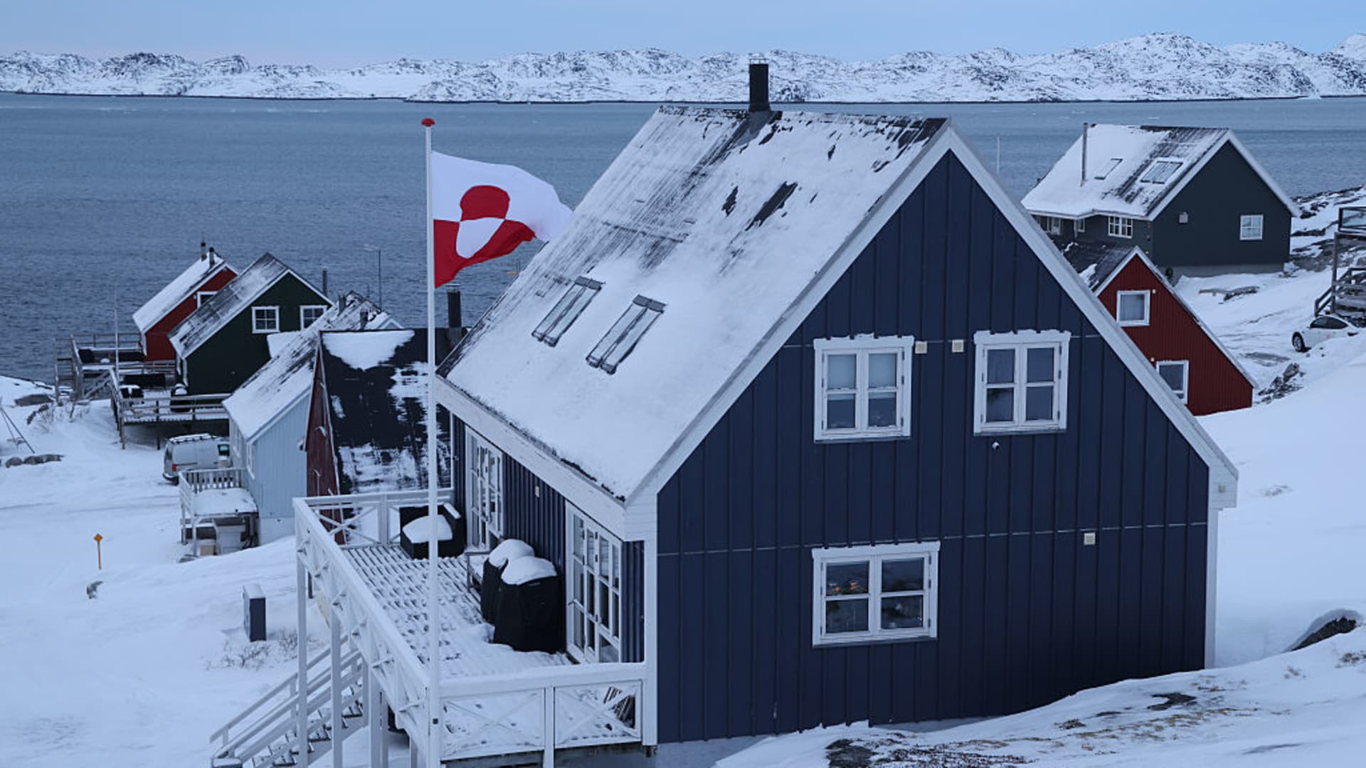 A Greenlandic flag flies over a residential house on Jan. 21, 2026 in Nuuk, Greenland.