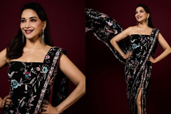Traditional Parsi Embroidery Meets Modern Silhouette In Madhuri Dixit’s Saree Gown