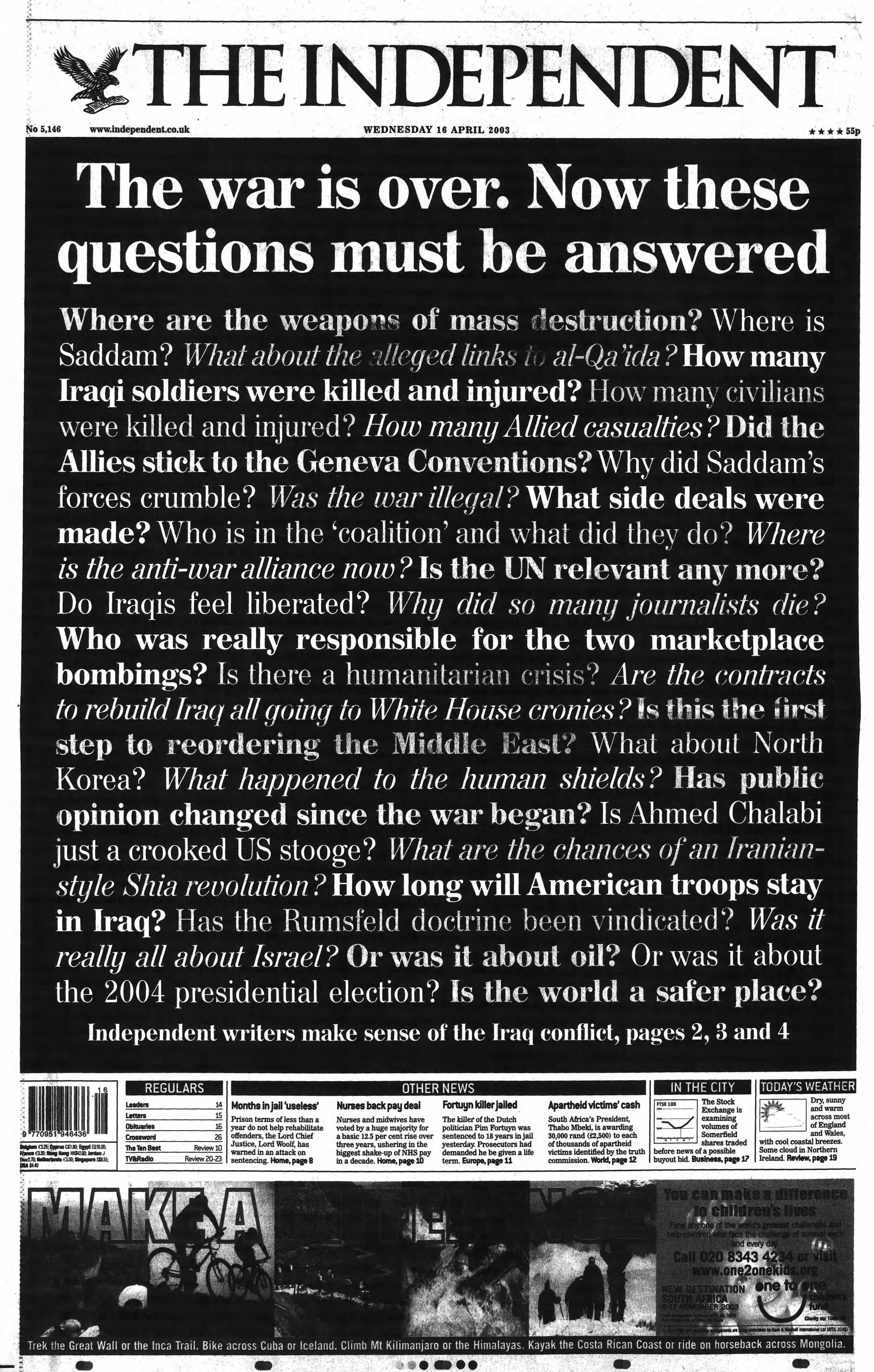 16 April 2003 – Unanswered questions as the Iraq War concludes