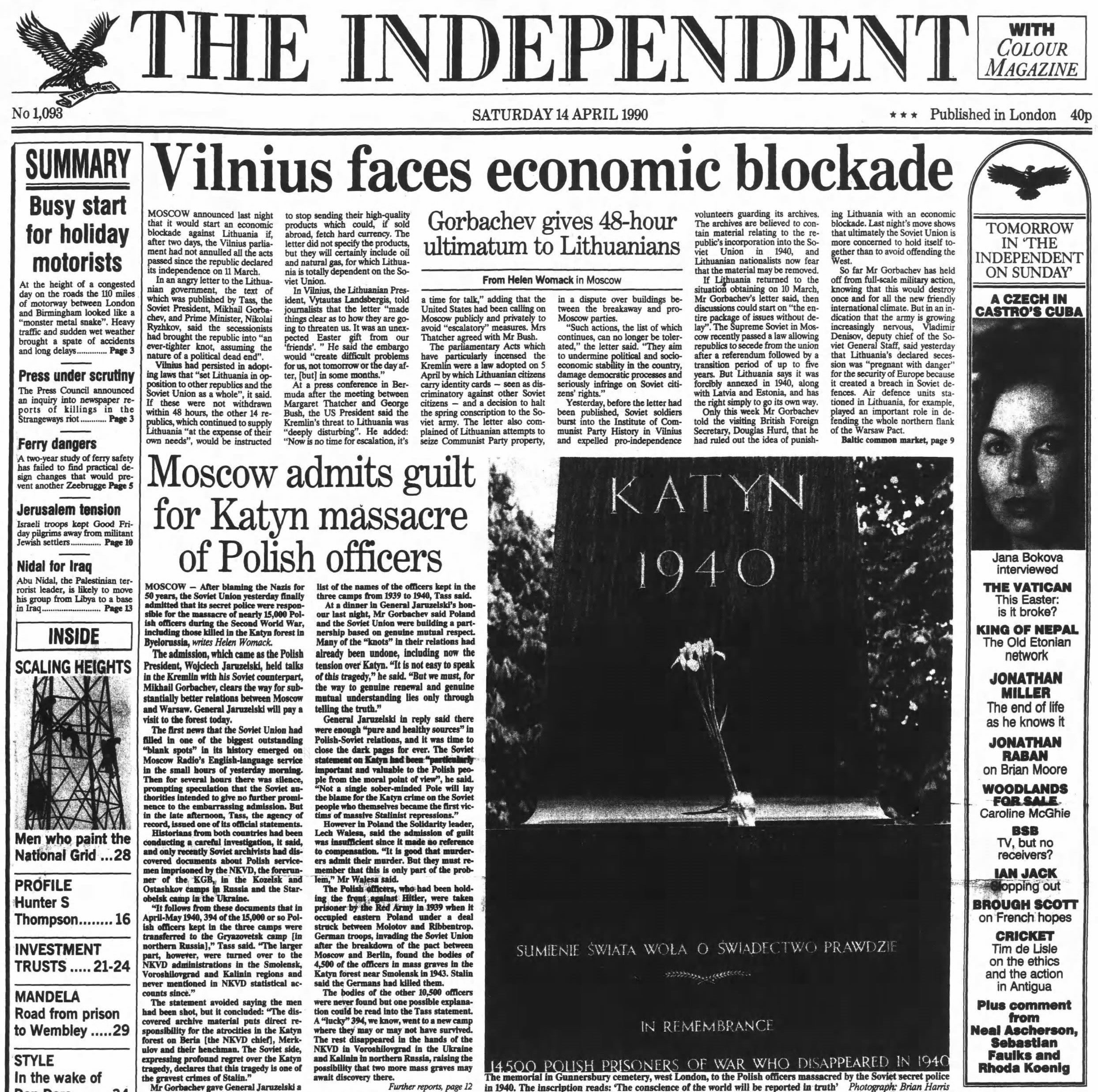Soviet leader Mikhail Gorbachev issues a 48-hour ultimatum to Lithuania, threatening an economic blockade if the republic refuses to annul its recent declaration of independence. Meanwhile, in a historic reversal after 50 years of blaming the Nazis, the Soviet Union finally admits its own secret police were responsible for the Second World War Katyn massacre of nearly 15,000 Polish officers.